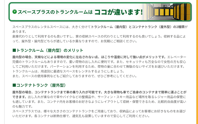 スペースプラスは、長期利用・屋内保管が必要なユーザーにとってコスパ・設備・サポート面で信頼できる選択肢です。