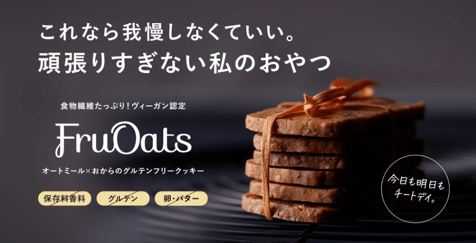 FruOats(フルオーツ)は、“罪悪感なしに楽しめるヘルシーおやつ” を目指して作られた、こだわり素材・無添加・ヴィーガン対応を備えたグルテンフリークッキーです