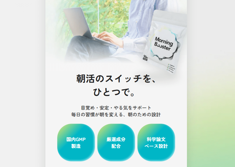 Morning Boosterは、朝活を始めたいのに動き出せない人や、コーヒーだけでは物足りなさを感じている人に向けた朝活専用サプリメントです。成分量が公開されていて、料金や定期条件も比較的わかりやすく、試しやすさはある商品といえます。