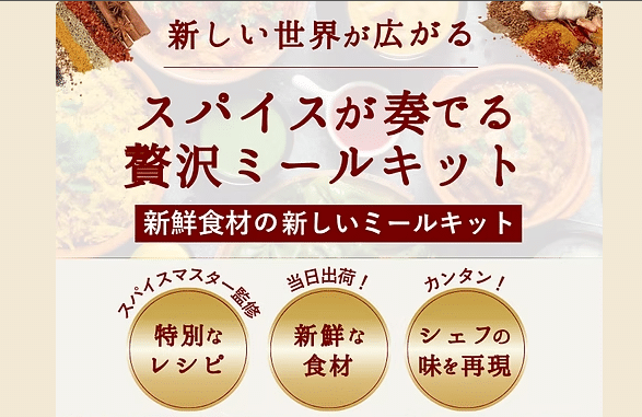 金沢発のスパイスミールキットブランド。主菜+副菜の2品構成で、海外テイストの本格的なレシピが中心(例:モロッカンビーフ、タスカンステーキ など)。調理時間は2品で30分以内を想定。