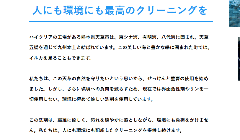 ハイクリアは、熊本県天草市にある自社クリーニング工場から、全国へ衣類を届ける宅配クリーニングサービスです。
