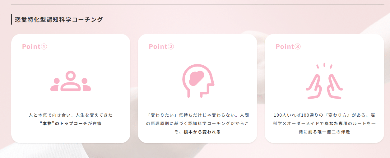 自身の価値観・恋愛歴・現状を踏まえてプランを組んでくれるので、「合わないアドバイス」を押し付けられることが少ない。 -