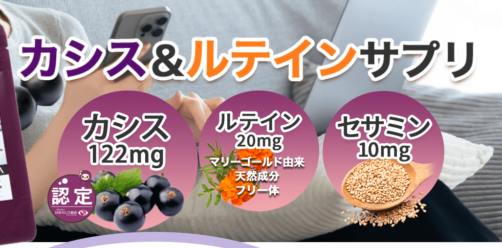 くっきりメクリアでは、カシス由来成分を122mg配合。日常的に目を酷使する方の栄養補給をサポートする設計になっています。