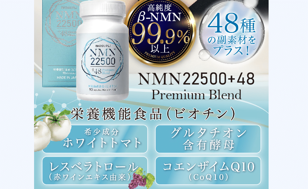 NMN22500+48は、株式会社バイオ・サプリが販売しているNMNサプリメントです。公式情報では、純度99.99%以上のβ-NMNを22,500mg配合し、さらに48種類の美容・健康素材を組み合わせた商品として案内されています。加えて、NMNの純度・含有量は分析試験済み、国内GMP認証工場で製造とされており、品質面を意識して選びたい人から注目されやすい内容になっています。