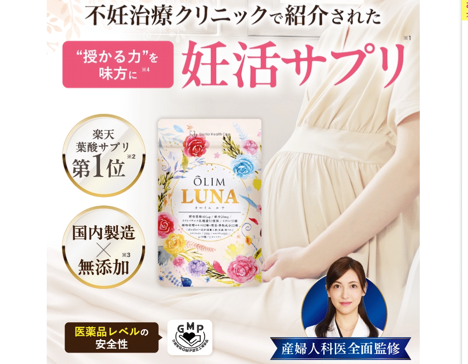 DHCが開発したオーリムルナ(Olim Luna)は、葉酸400μgを目安量で摂りやすく、鉄・カルシウム・ビタミンB群などもまとめて補える設計のサプリメントです。
