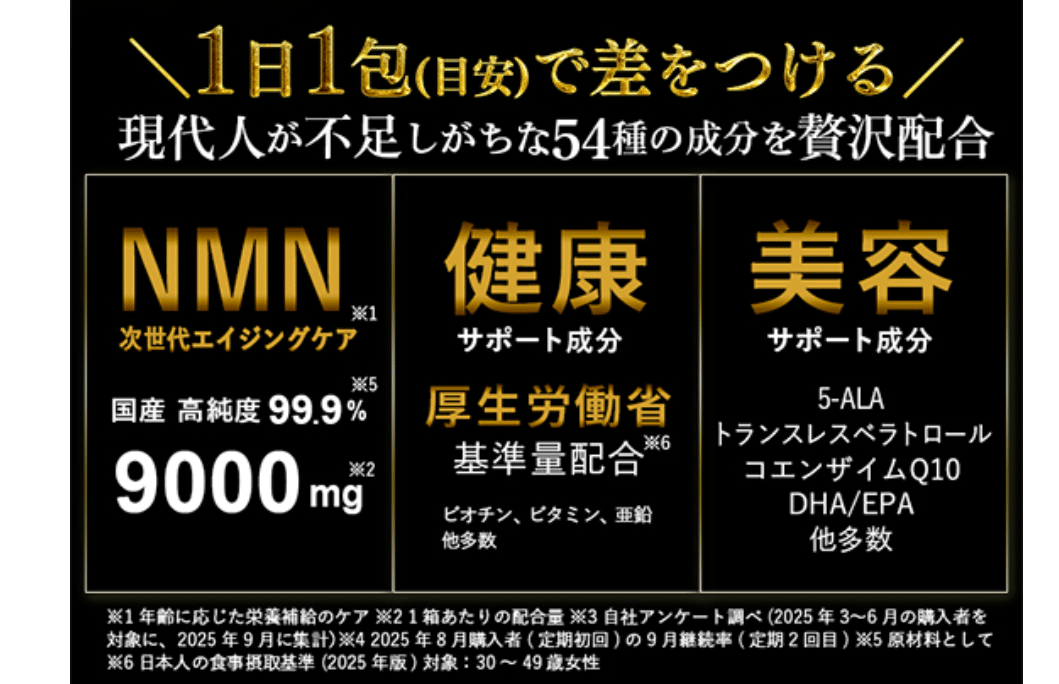 | 成分設計 | NMNを含む54種類の成分をまとめて摂りやすい | 成分が多いぶん、シンプル志向の人には過剰に感じる可能性 |