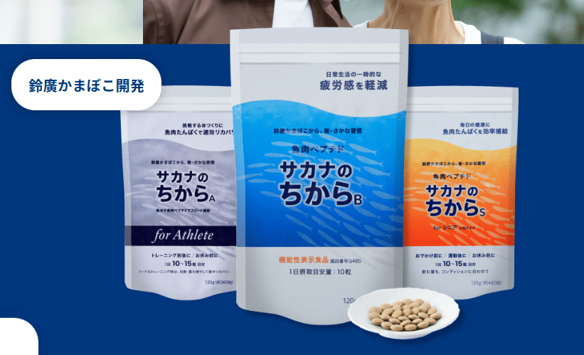 「サカナのちから」は、老舗かまぼこメーカー・鈴廣かまぼこが開発した、魚由来のアミノ酸サプリメントです。