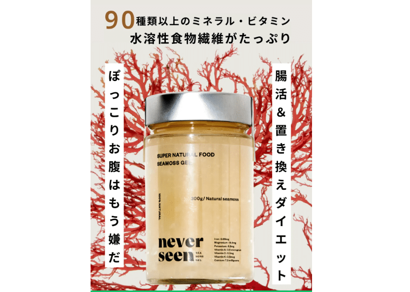 腸活シーモスジェルとは、NEVERSEENが販売するジェル状のシーモス食品です。シーモスは海藻の一種で、公式サイトでは「水溶性食物繊維や90種類以上のミネラルを含む」と案内されています。商品はOriginal(オリジナル)とUme(梅風味)の2種類があり、内容量は280gです。原材料は、オリジナル商品ページでは「シーモス(フィリピン産)・ライム果汁」と記載されています。